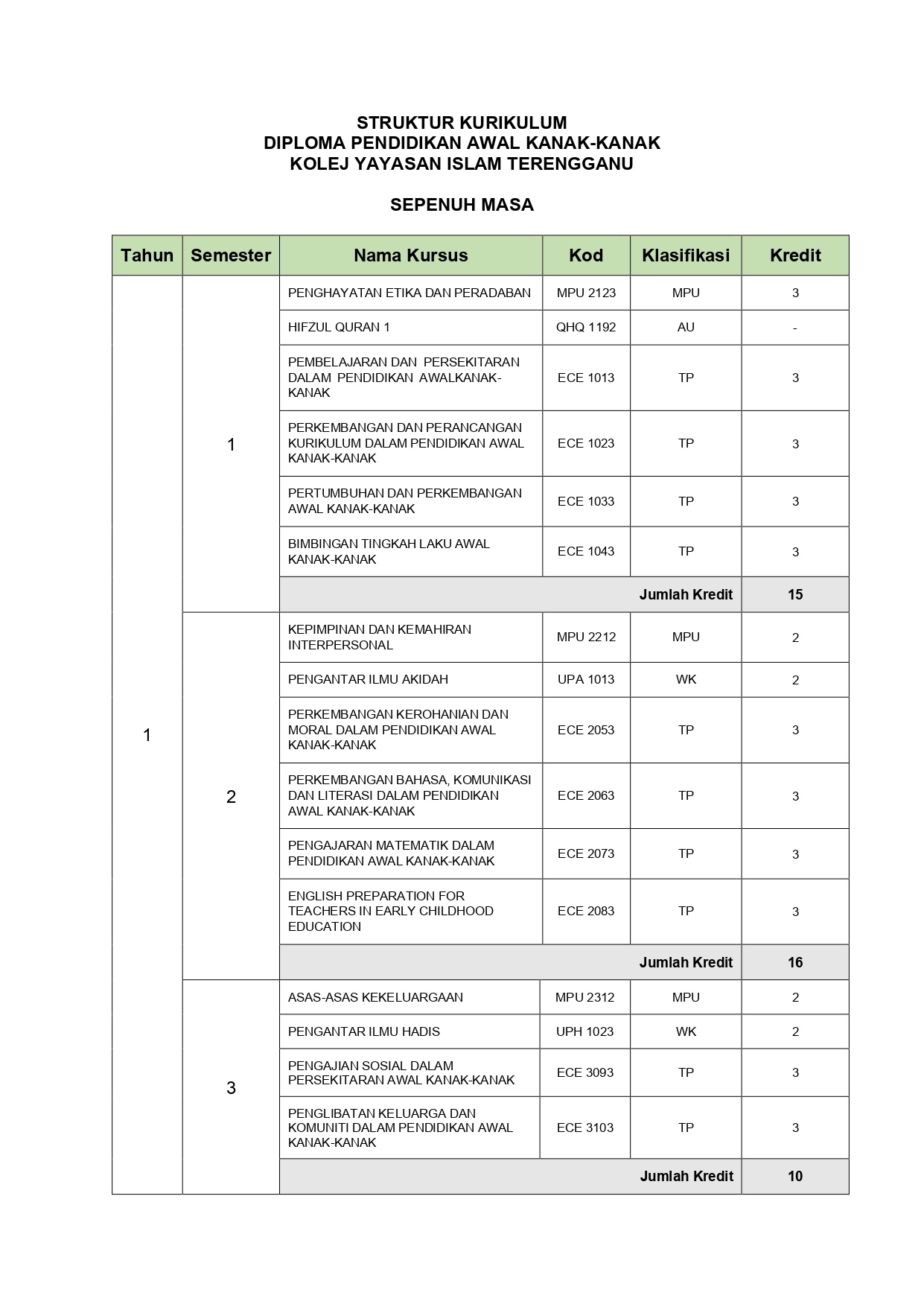 Program yang ditawarkan oleh KYIT dijalankan secara sepenuh masa selama 2 tahun 6 bulan (5 semester panjang dan 2 semester pendek).